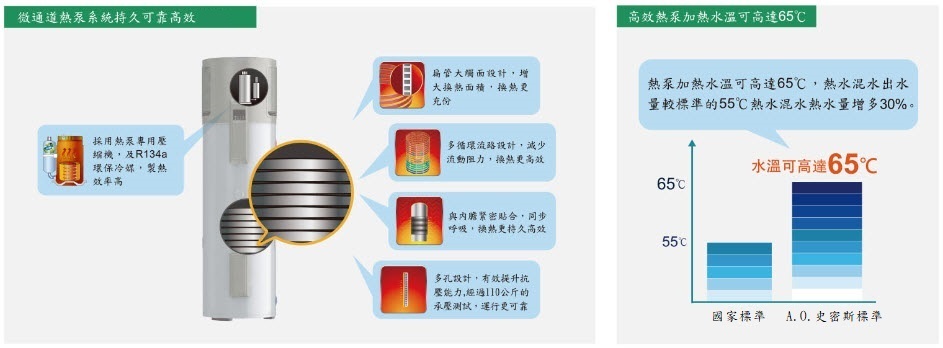• A.O.Smith微通道整體式熱泵熱水器系統,加熱水溫可高達65ºC