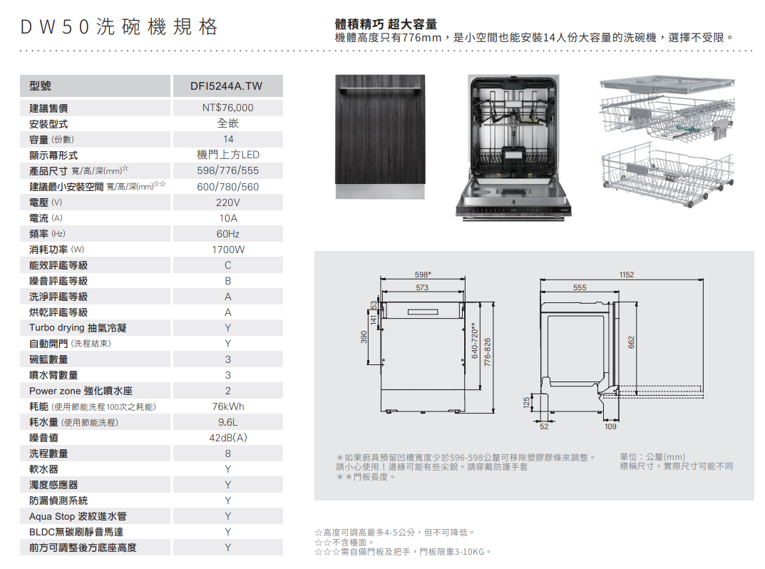 洗程結束時自動開門 | 檯面下緣最低可安裝高度780mm