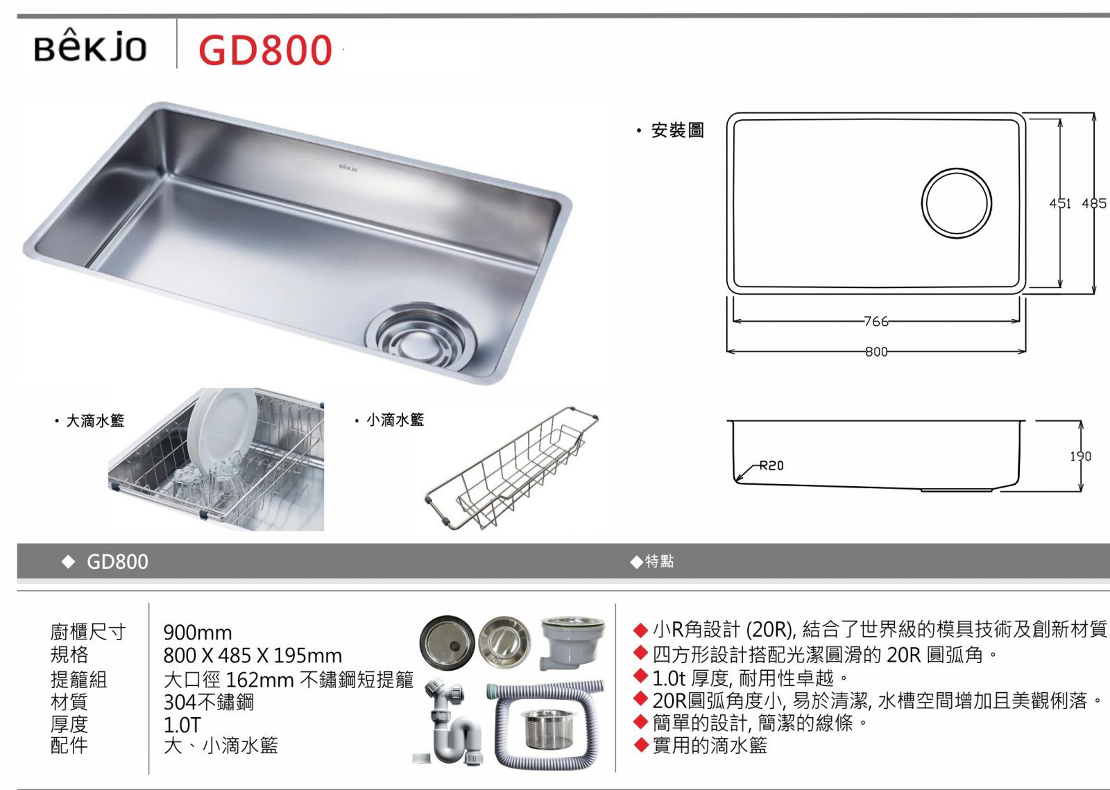 Bekjo 不鏽鋼水槽(80x48.5cm) GD800
