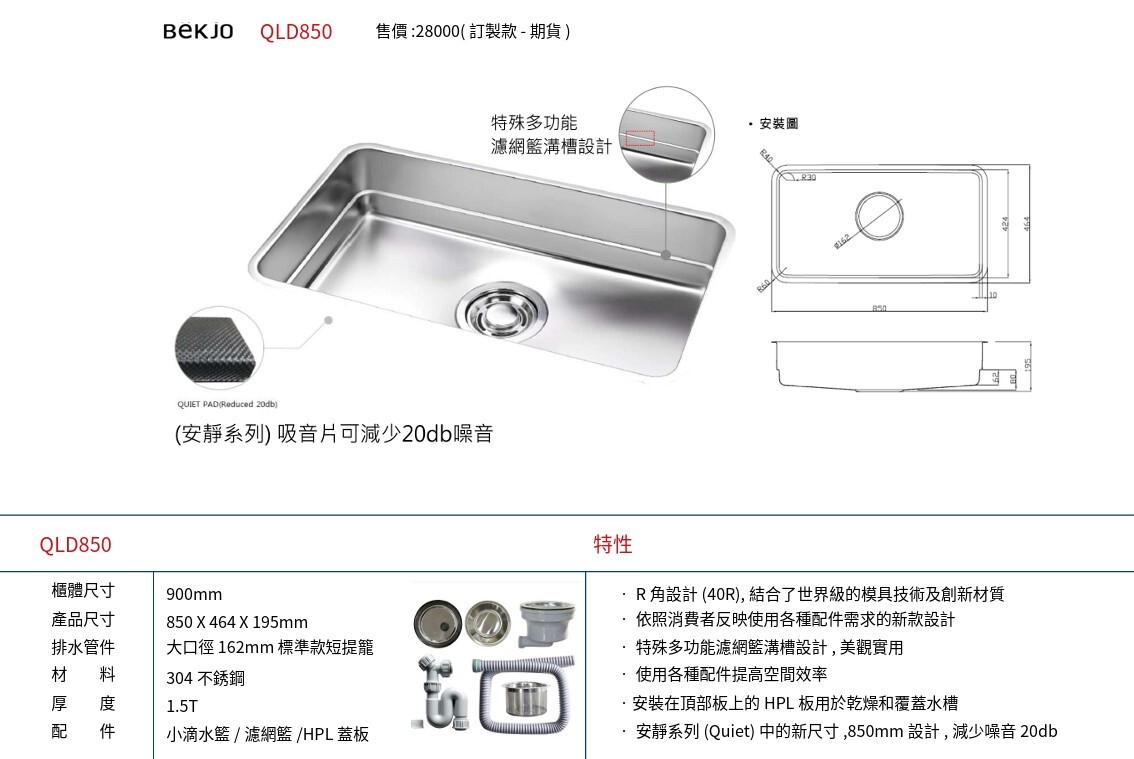 • Bekjo 不鏽鋼水槽(85x46.4cm) QLD850 Baekjo