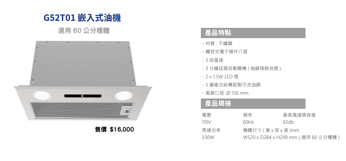 GlemGas 隱藏式排油煙機(60cm) G52T01【全省免運費宅配到府】