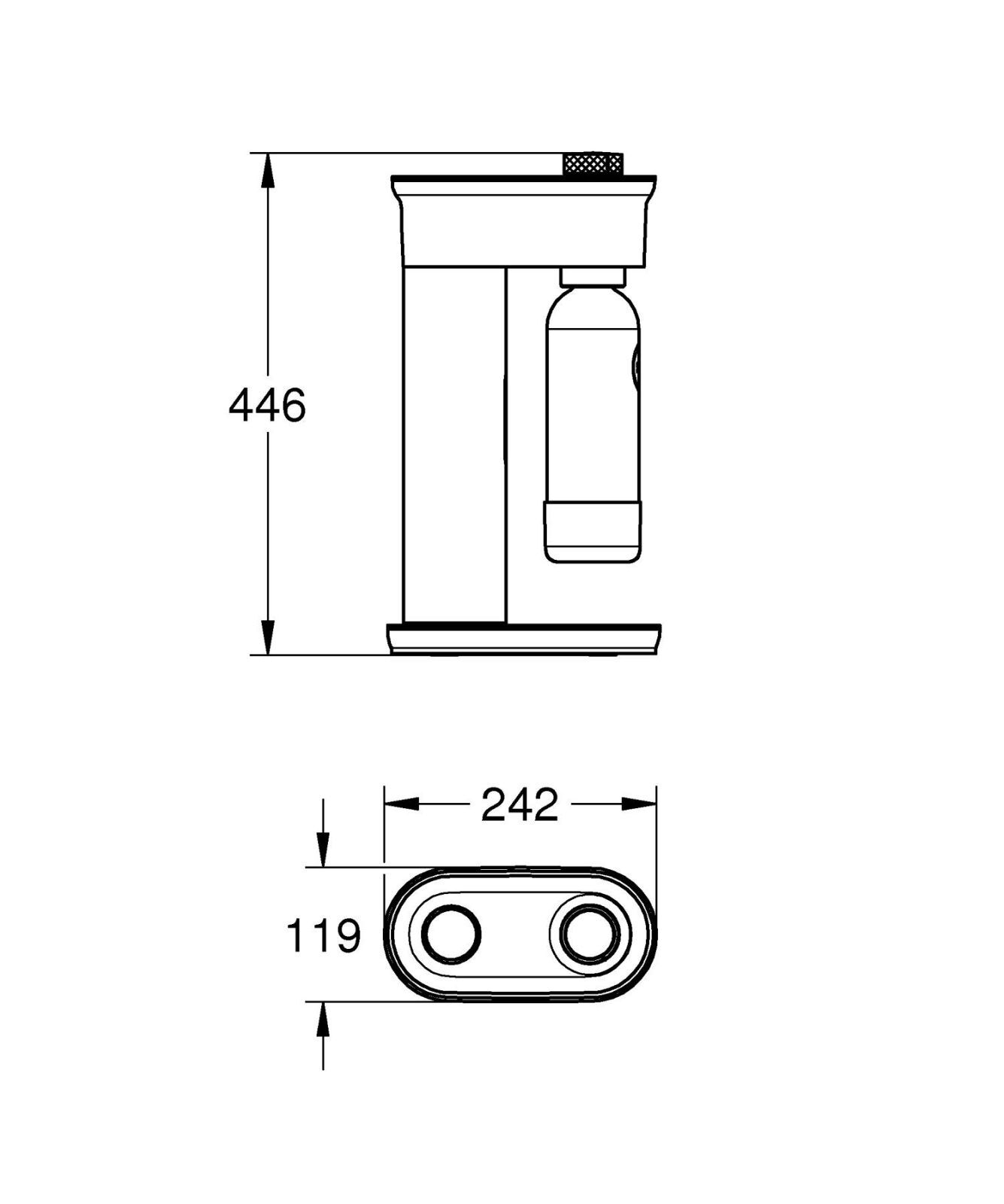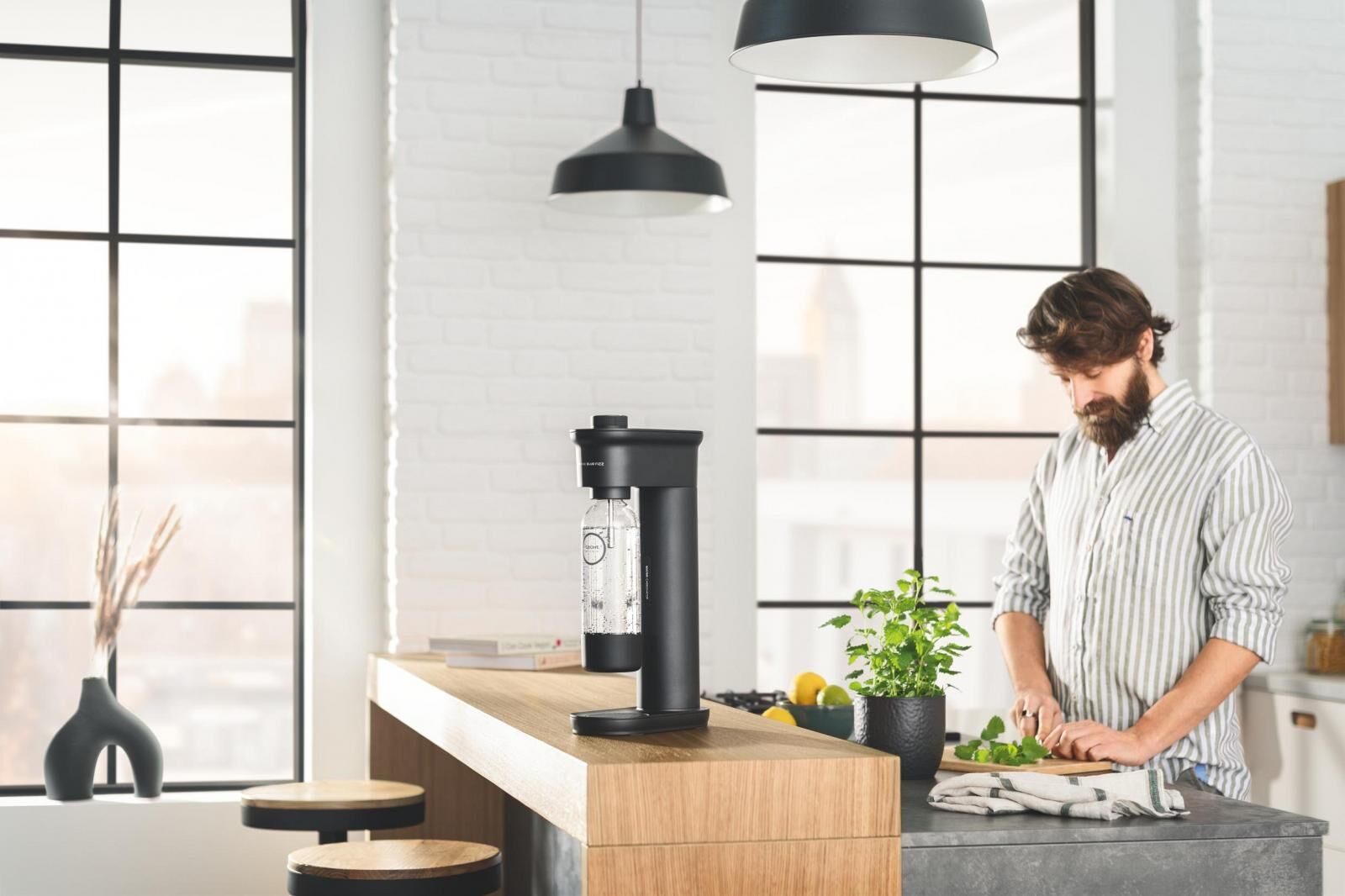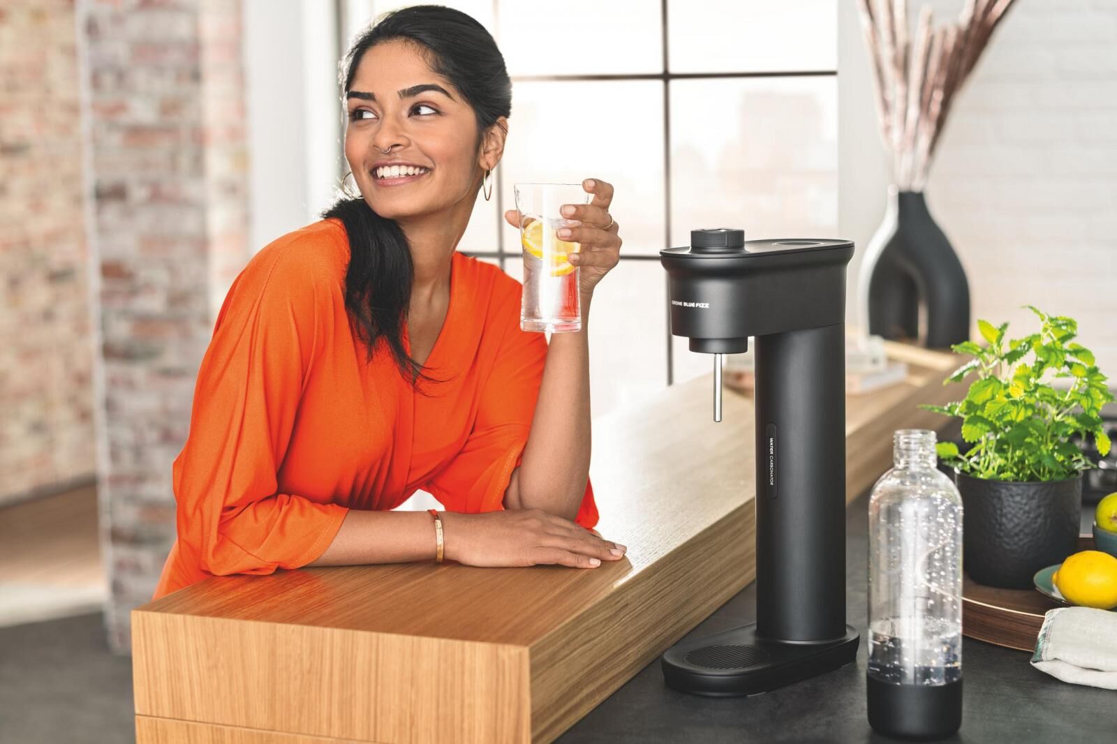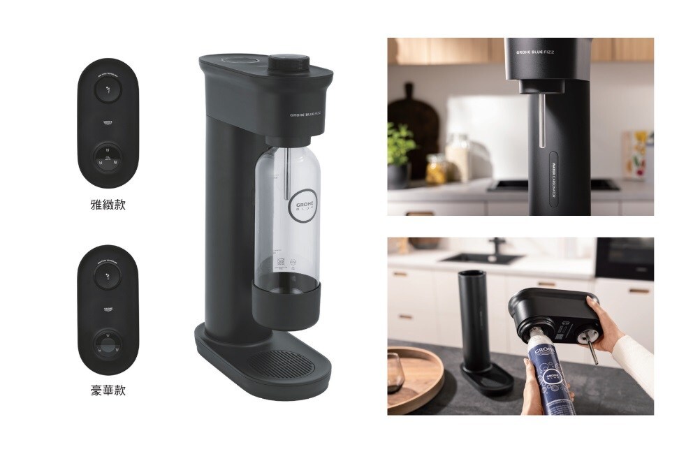 (左圖: 一鍵式打氣技術,按下按鈕即可享有理想的氣泡濃度。、右圖: 從下方快速且輕鬆地旋轉,輕鬆提取CO₂氣瓶更換。)