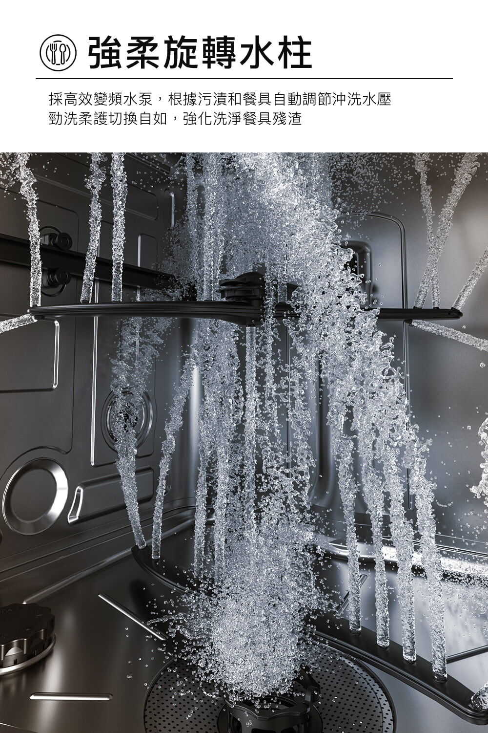 • 強柔旋轉水柱 : 高效變頻水泵,自動調節水壓