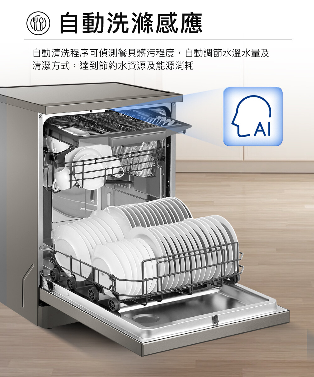 • 自動洗滌感應 : 偵測餐具髒污程度,自動調節水溫水量及清潔方式