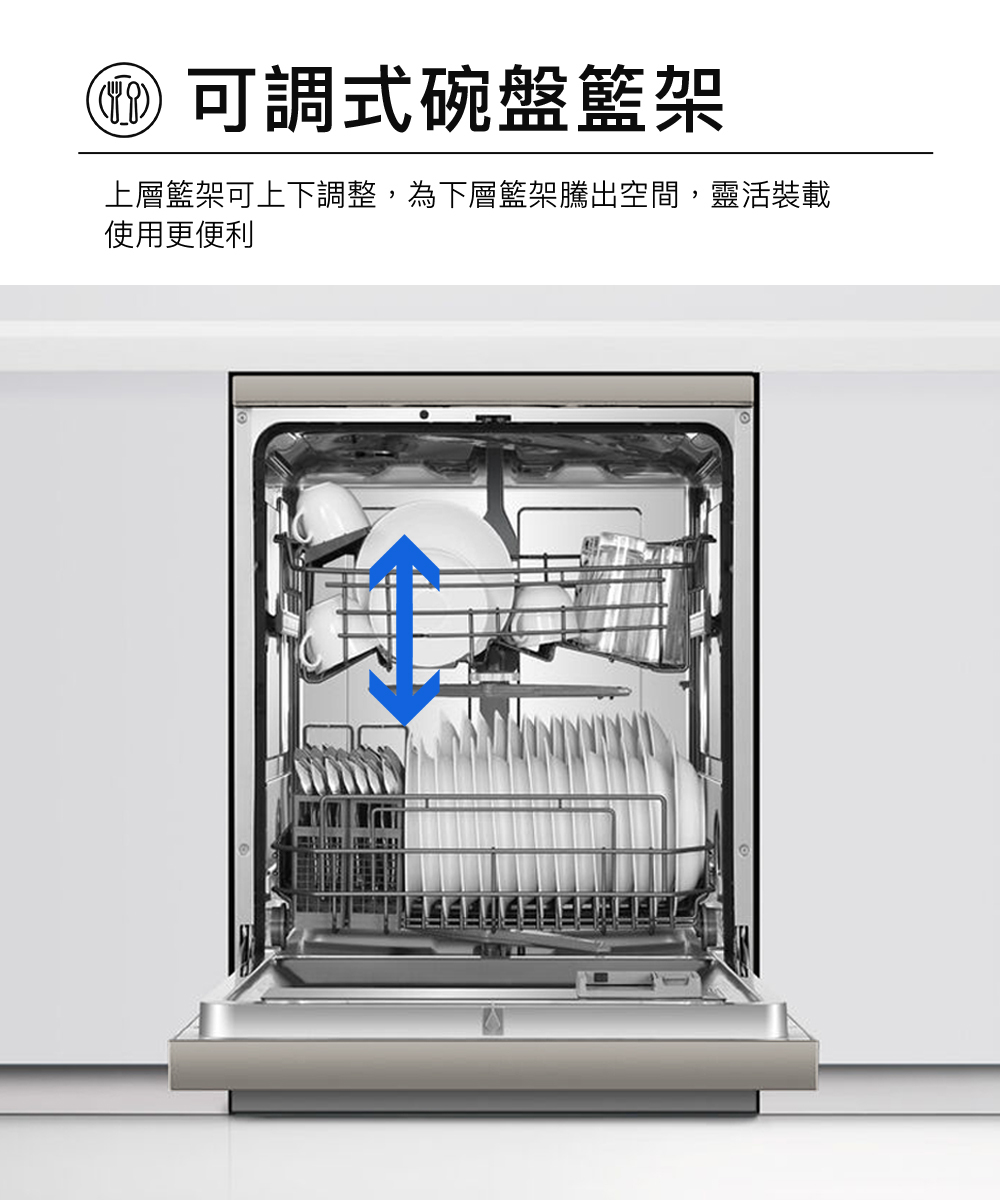 • 可調式碗盤籃架 : 上層籃架可上下調整,靈活裝載更便利