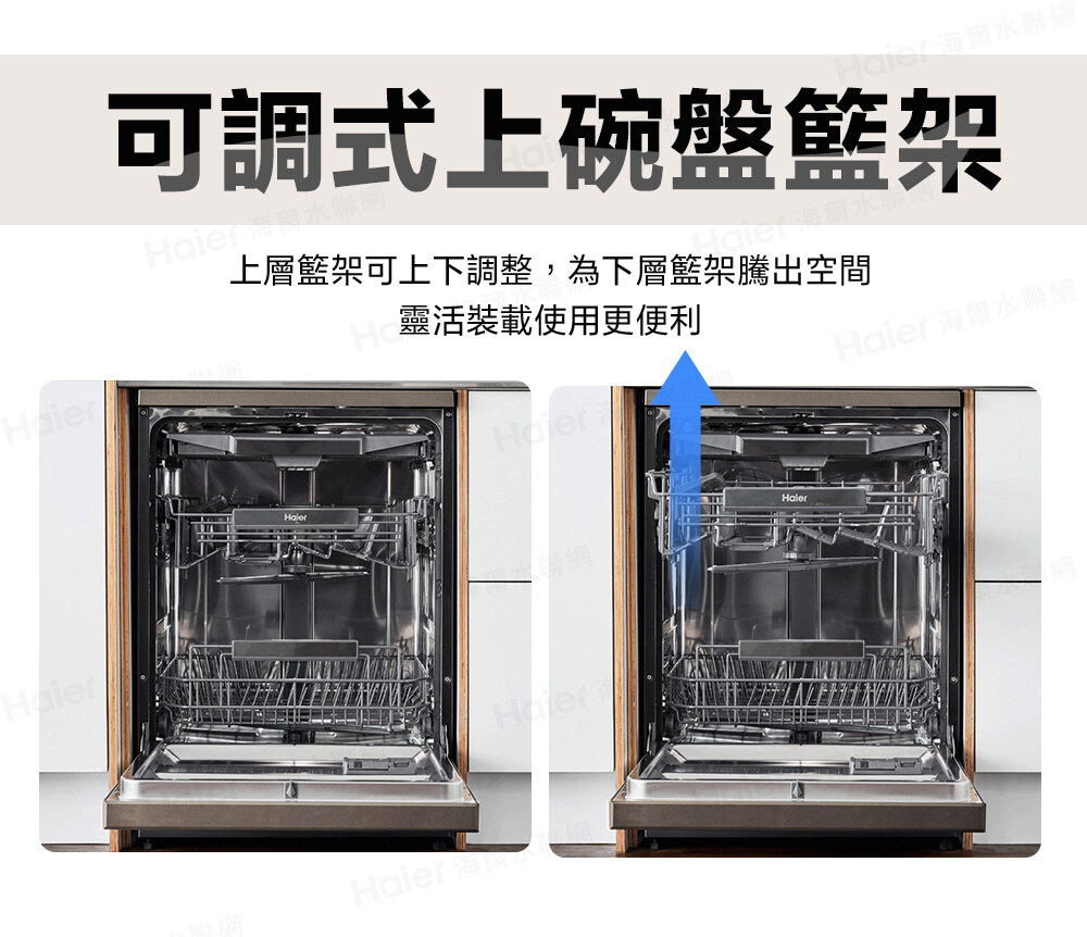 • 可調式碗盤籃架 : 上層籃架可上下調整,靈活裝載更便利