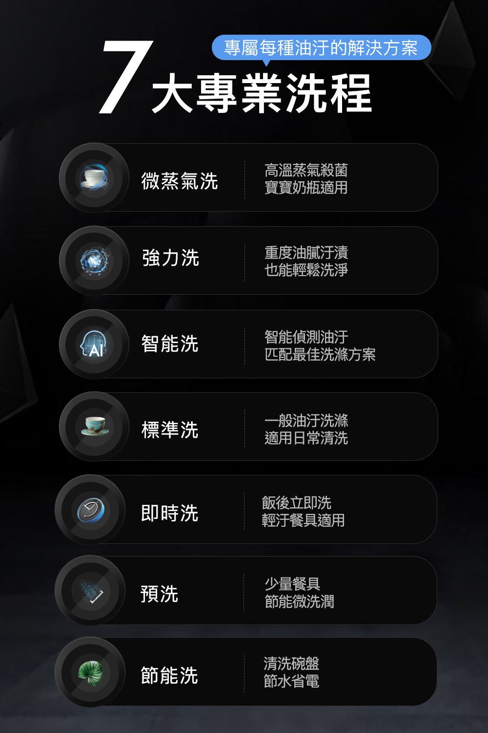 • 自動洗滌感應 : 偵測餐具髒污程度,自動調節水溫水量及清潔方式