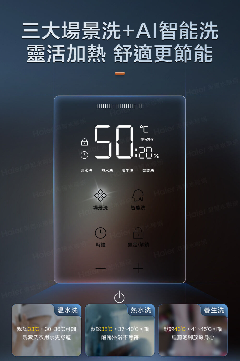 • 3大場景洗+AI智能洗:靈活加熱,舒適更節能