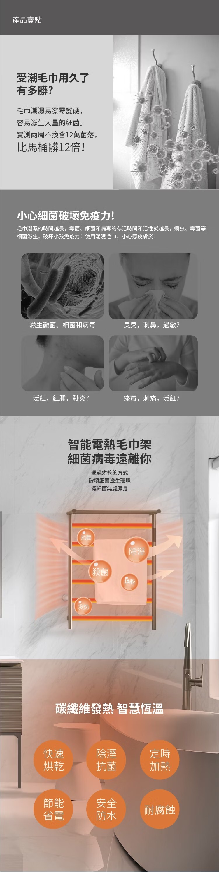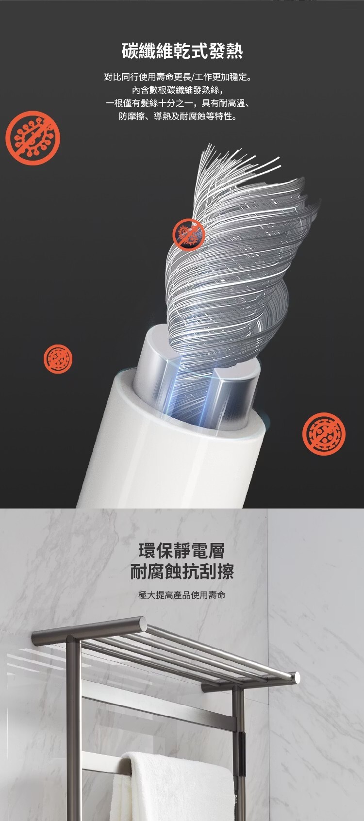 • 專為衛生間乾濕分離設計的上下結構,避免乾濕毛巾交叉接觸