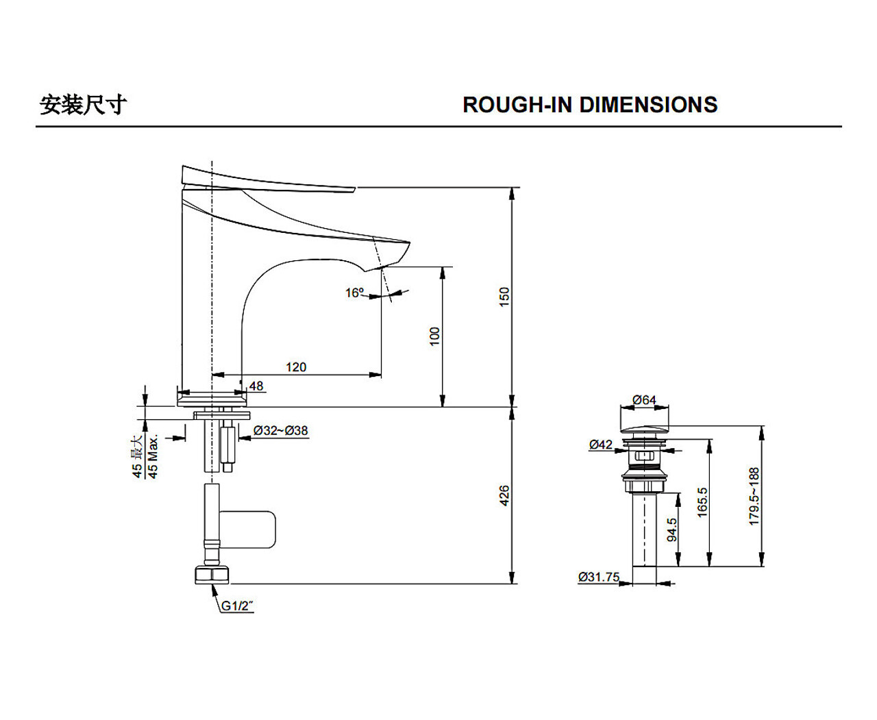 KOHLER Fore Arc 臉盆龍頭 K-29546T-4-CP 尺寸圖