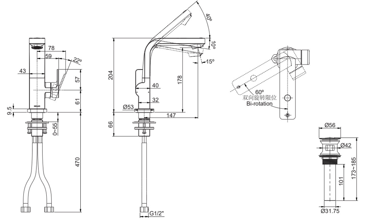 KOHLER Parallel 可調節式臉盆龍頭(霧黑) K-30734T-4-BL 尺寸圖