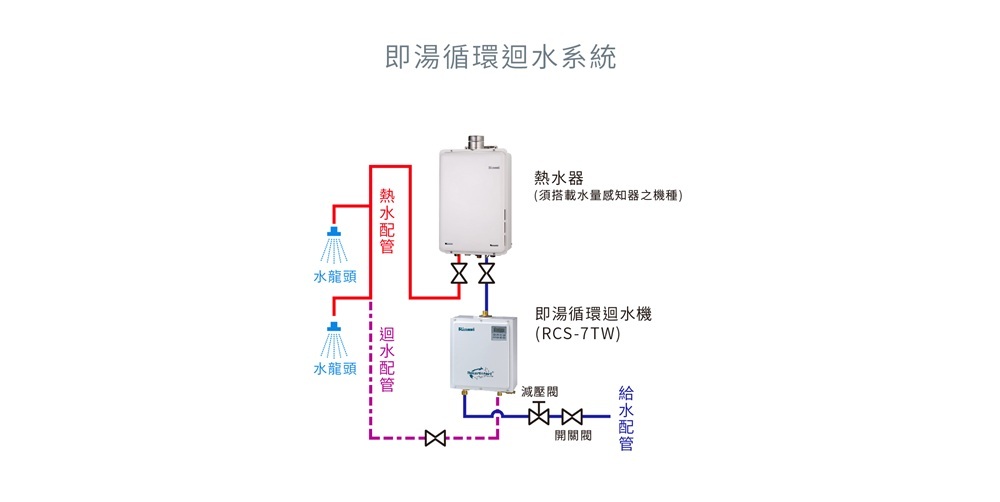 下方加裝循環迴水機(RCS-7TW),距離再遠,熱水也能隨傳隨到。