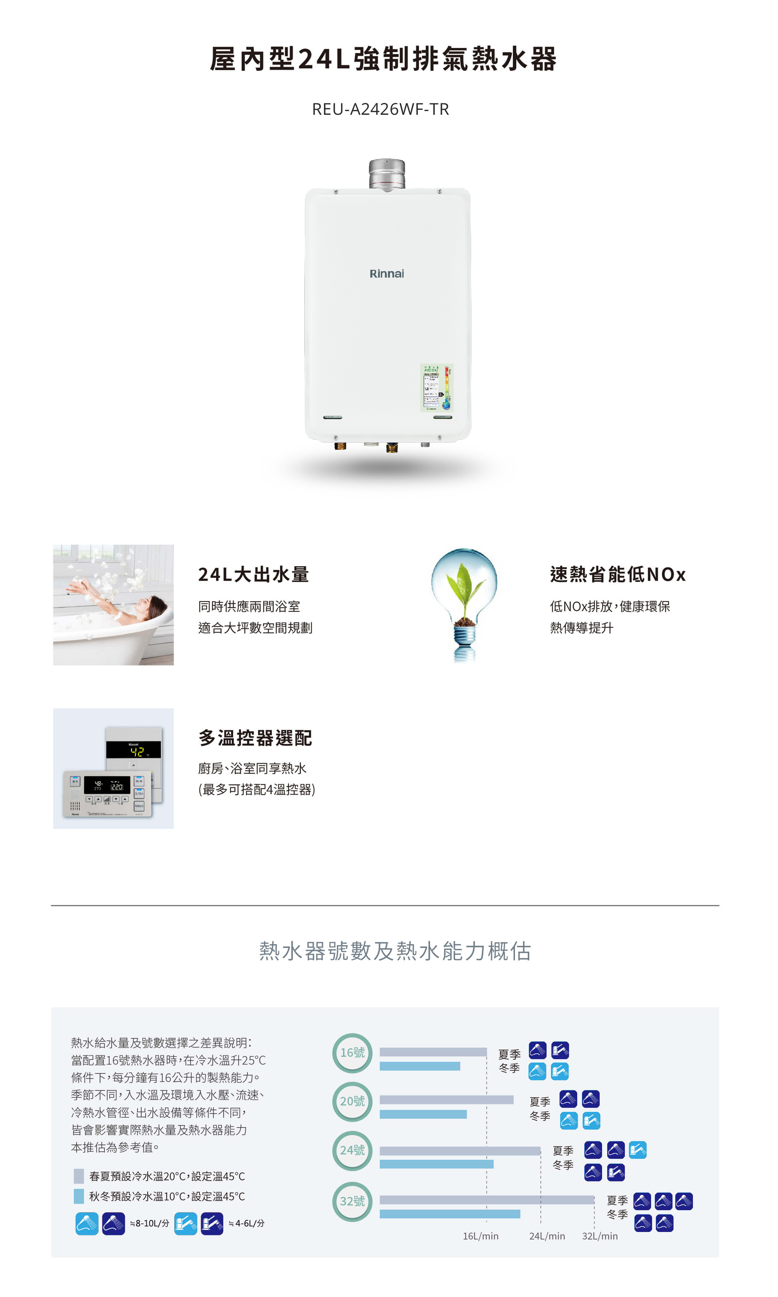 日本原裝 - 日本原裝林內牌(Rinnai)屋內型強制排氣熱水器(24L) REU-A2426WF-TR
